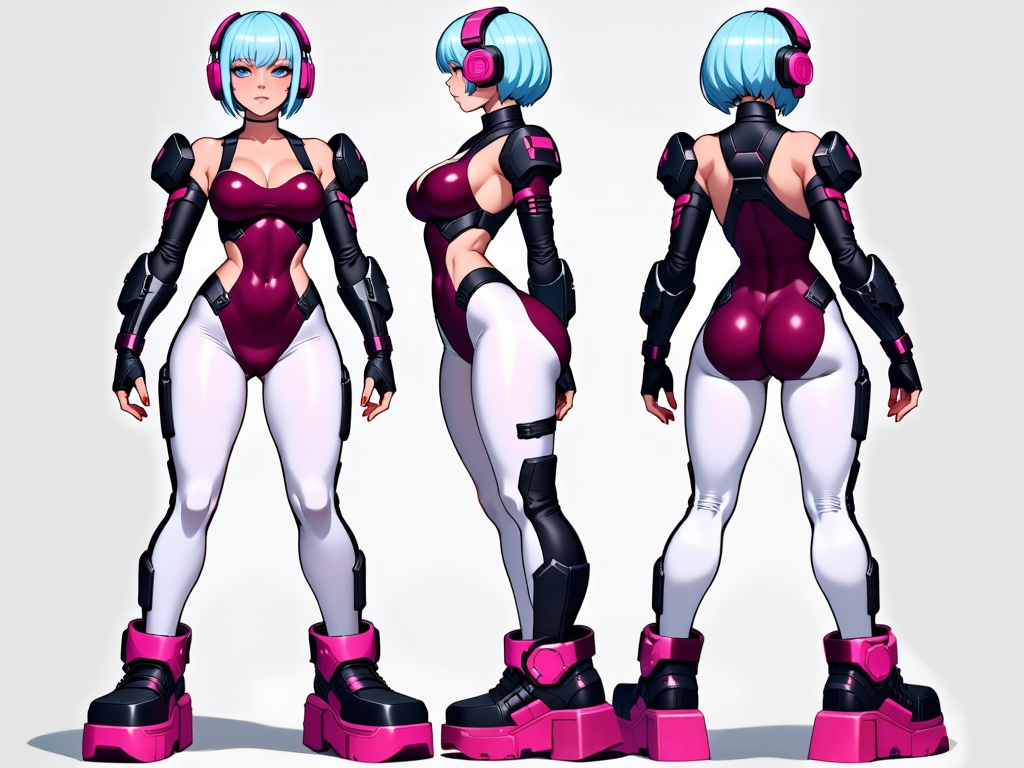 The anime-style illustrations with multiple angles shows tall girl. She wears white pantyhose and wine red cyberpunk high-cut leotard and black futuristic long gloves. She has light blue bob cut hair. She wears light pink platform shoes. She wears pink cyberpunk headphones. extremely detailed, simple background, 8K, portrait, | アニメ調の多角的イラストは背の高い少女を描いている。彼女は白のパンティストッキングとワインレッドのサイバーパンク風ハイカットレオタード、黒の未来的なロンググローブを着用。髪はライトブルーのボブカット。足元はライトピンクのプラットフォームシューズ。ピンクのサイバーパンク風ヘッドホンを装着。極めて詳細な描写、シンプルな背景、8K解像度、ポートレート形式。 |