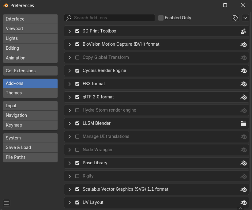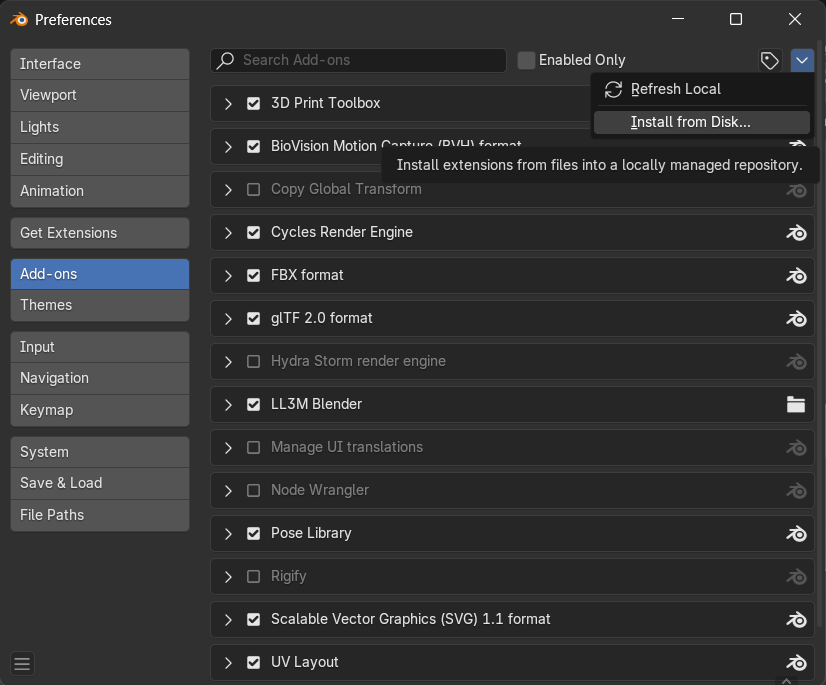 私の画面ではすでにLL3M Blenderというアドオンが表示されています。