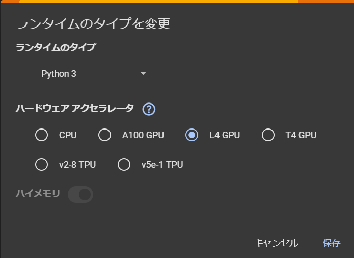 そのため、google ColaboratoryのランタイムのタイプでハードウェアアクセラレータをT4 GPUからL4 GPUに変更しました。