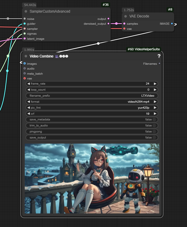 SamplerCustomAdvancedノードで1分くらいかかっています。Mochi 1で1時間近くかかっていたことを考えると、圧倒的に早いです。ただ、GPU RAMは15GBを超えてしまうので、注意が必要です。