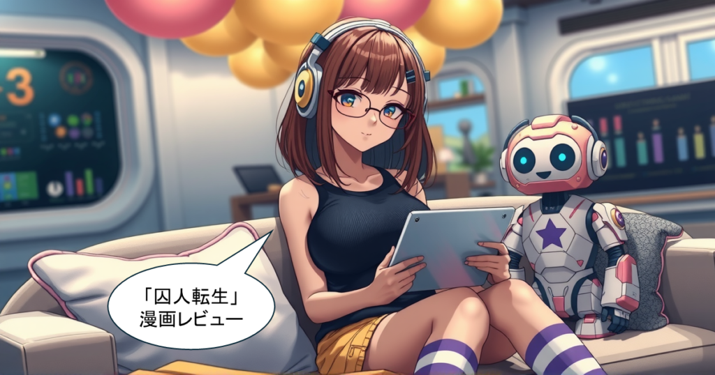 | niji style,A big-breasted girl with shoulder-length brown hair wearing futuristic headphones, glasses, a black tank top, yellow micro shorts, and purple striped thigh-high socks is sitting on a couch next to a mascot-like robot and looking at a tablet in a cute, futuristic room. | niji style,近未来的なヘッドフォン、メガネ、黒のタンクトップ、黄色のマイクロショーツ、紫のストライプのハイソックスを身につけた肩まである茶髪の巨乳の女の子が、近未来的なかわいい部屋の中で、マスコットのようなロボットの隣のソファに座ってタブレットを見ている。 |